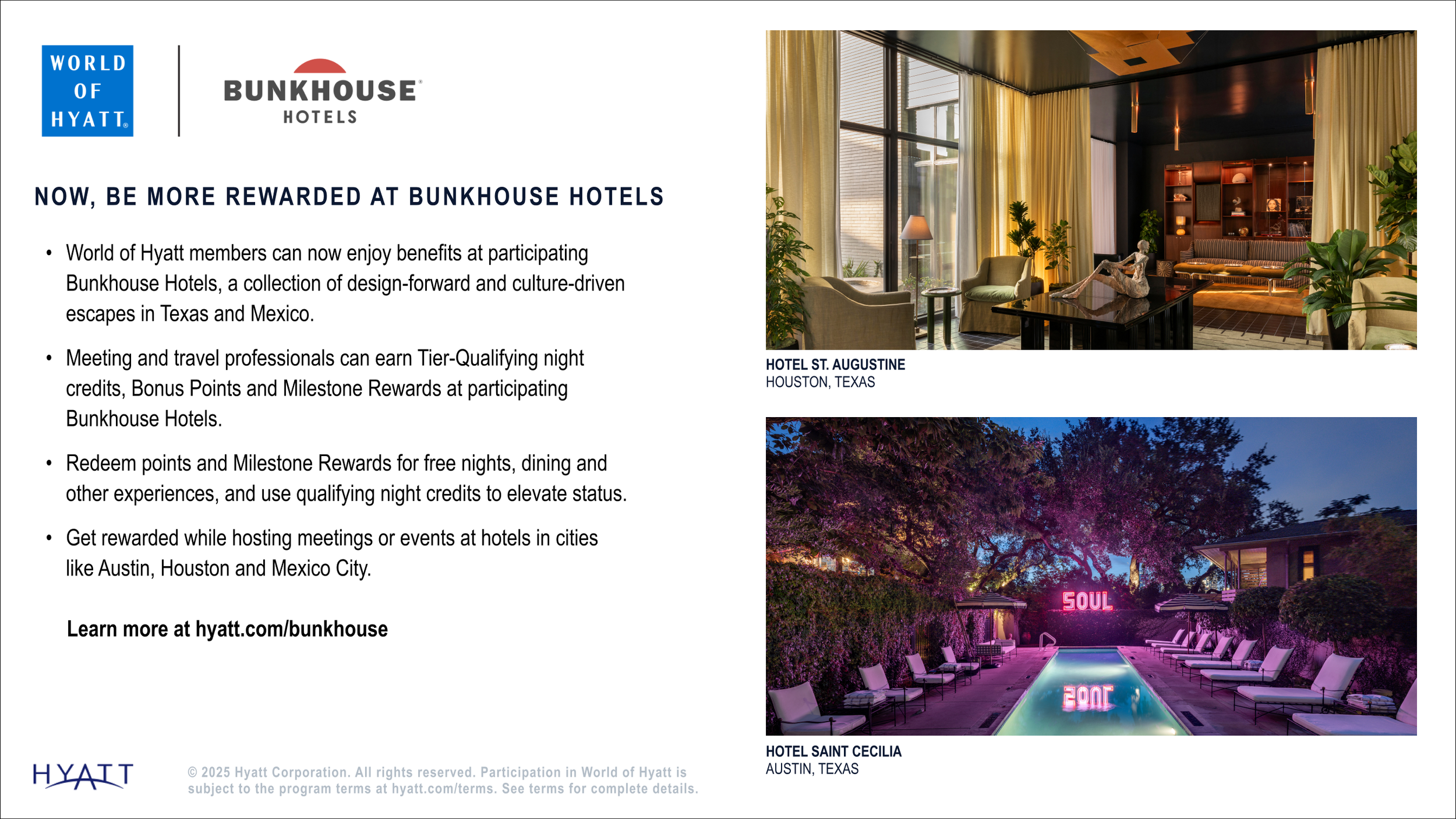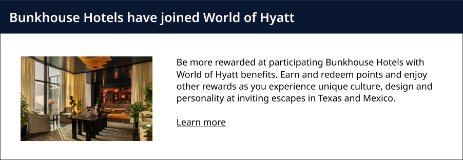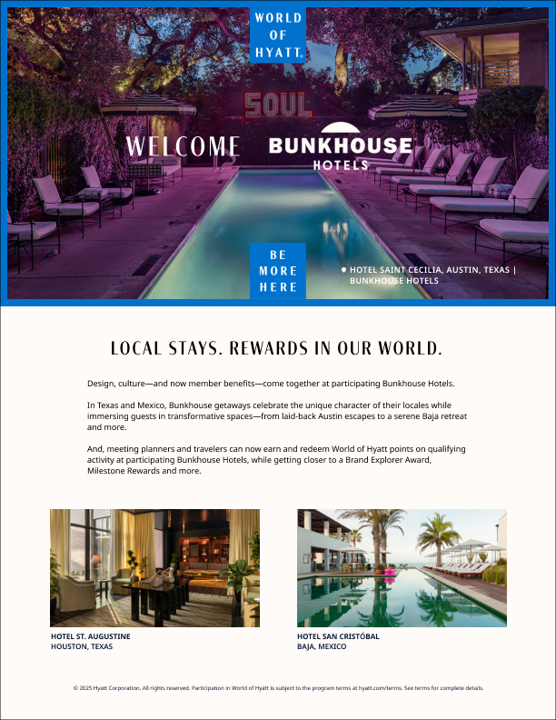 As Bunkhouse joined the World of Hyatt, I helped to create a series of assets to integrate the brands together. Website assets, display banners, a B2B flyer and Powerpoint screen are part of a campaign to help to spread awareness and excitement. This enables WOH members to enjoy rewards at uniquely local, culture-driven hotels in Texas and Mexico.